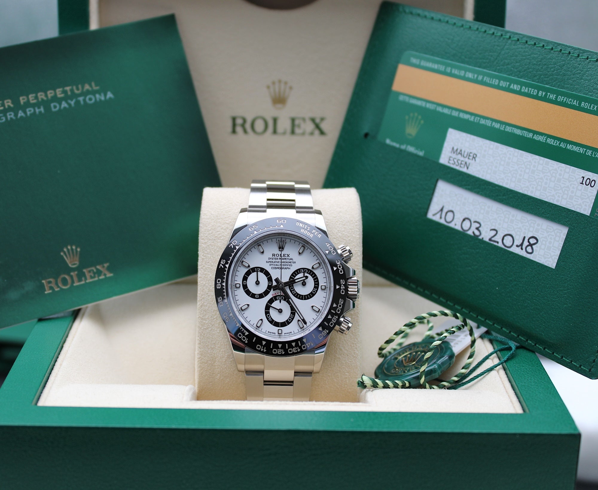 For sale is a new and unworn Rolex Daytona Weiss, adjusted reference 116500LN from 03/2018 LC100 without name entry, the watch is delivered in a full set with first purchase invoice, absolute top set with incomplete documentation.